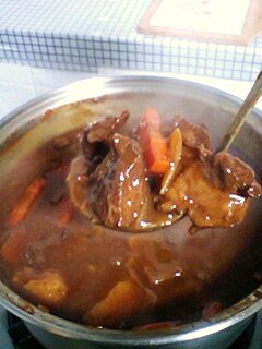えぇ~いたって普通のビーフシチュ~。市販のルウで作りました。 赤ワインを買って半分くらい使ってみた!とってもおいしく出来ました